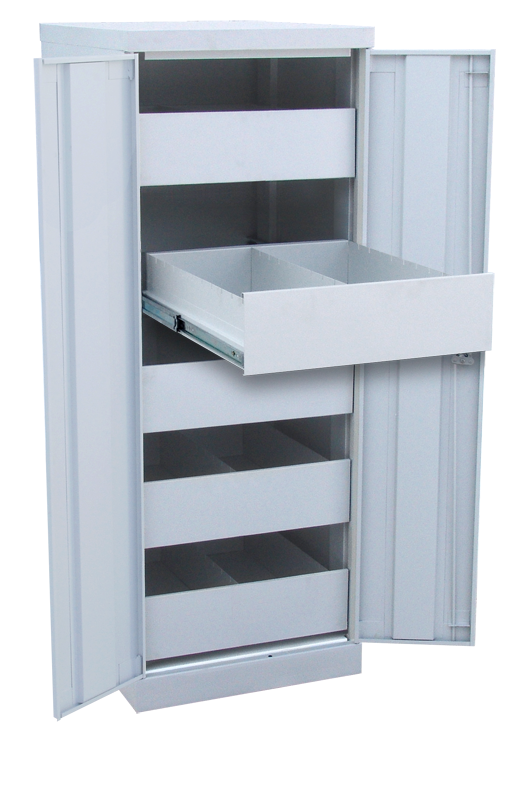 Шкаф ШК-5-Д2 оборудован распашными дверцами и пятью выдвижными ящиками на телескопических направляющих, в которых с удобством размещаются документы формата A5. Ящики разделены перегородкой, которая образует два отделения размером 120x216x270 мм.