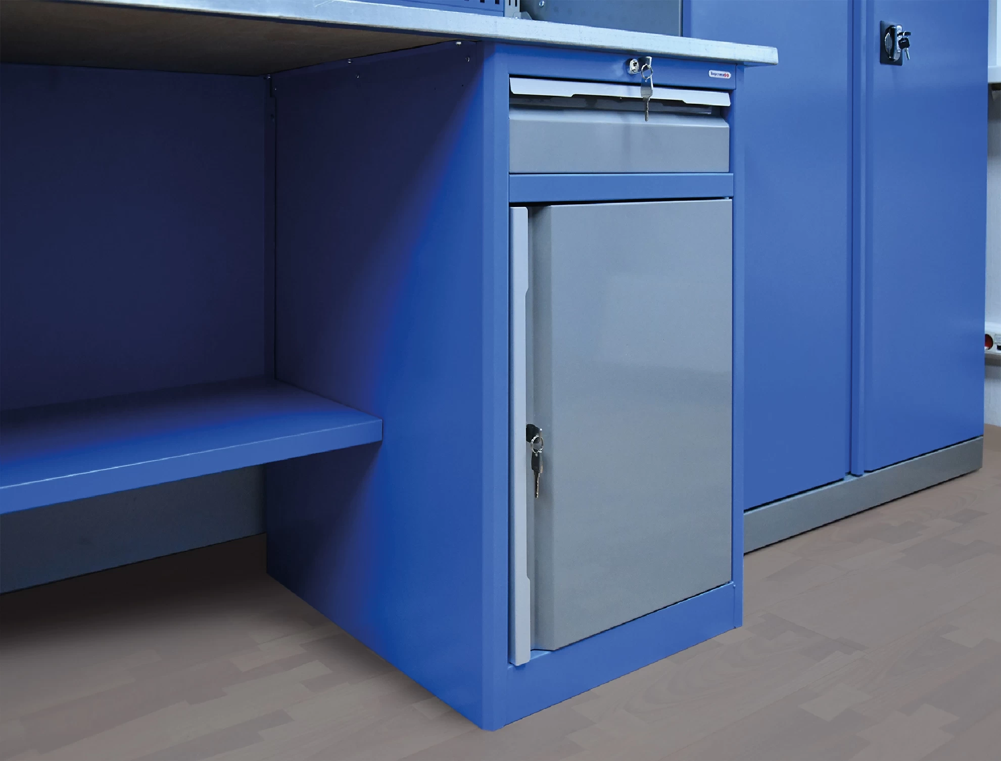 - Сварные тумбы содержат или ряд выдвижных ящиков – от трёх до шести, – или большое отделение с дверью и двумя полками, или отделение с полкой и отдельный ящик.